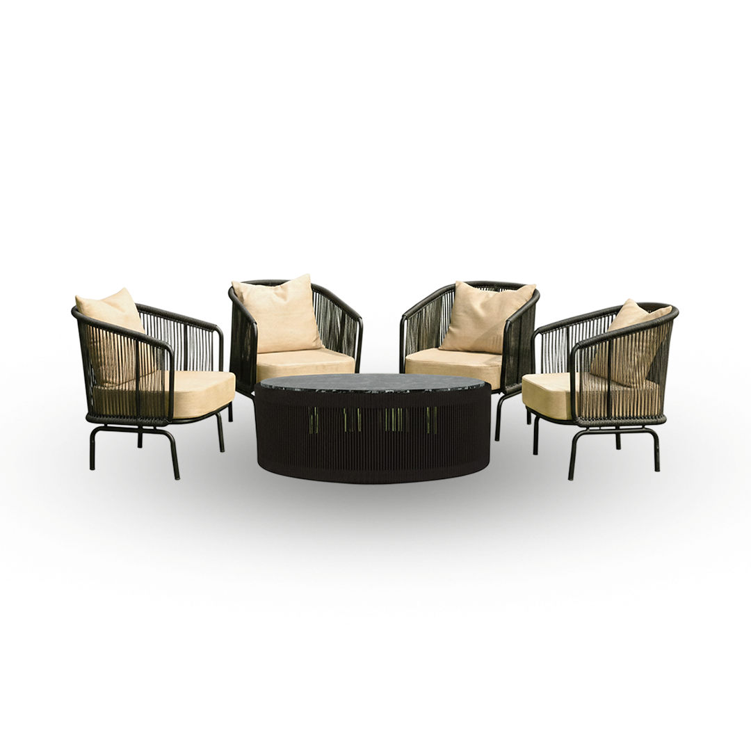 Featuring a 15-inch low-height sofa with durable powder-coated mild steel framing and soft sandy-toned cushions, it offers relaxed comfort with a minimalist feel. A round centre table with a customisable foam board top completes the set, making it ideal for cafés, patios, lounges, and contemporary homes.